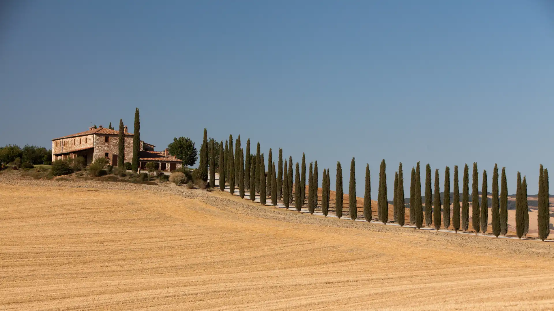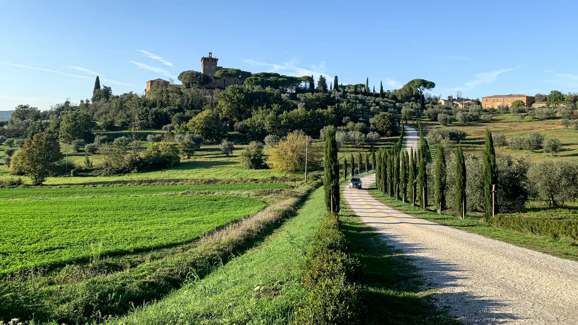 Drive through the iconic landscapes of Val d’Orcia, with rolling hills, cypress-lined roads, and breathtaking views.